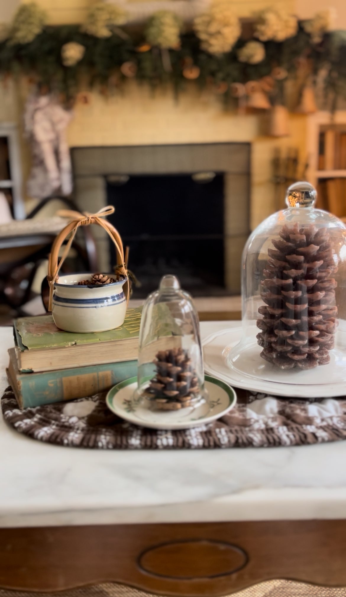 Blue Striped Pottery Basket with Bamboo Handle (ribbon and pinecones included)