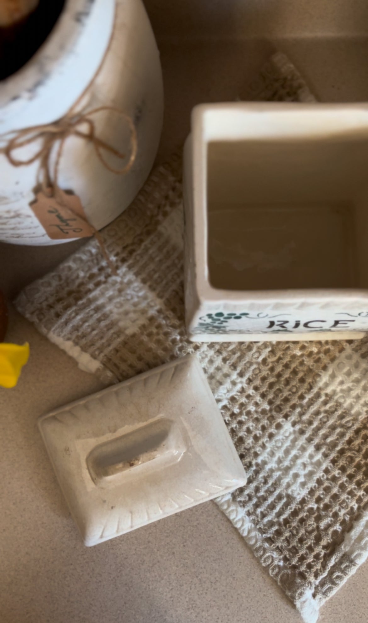 Add a touch of charm to your kitchen with our Ceramic Canister Set made in Germany! Includes a large rice canister and three spice canisters (cinnamon, ginger, and cloves) for all your cooking needs. These canisters have gorgeous vintage crazing and discoloration that will add lots of character and charm to your kitchen. Cloves canister has a chip in the lid as seen in pictures.