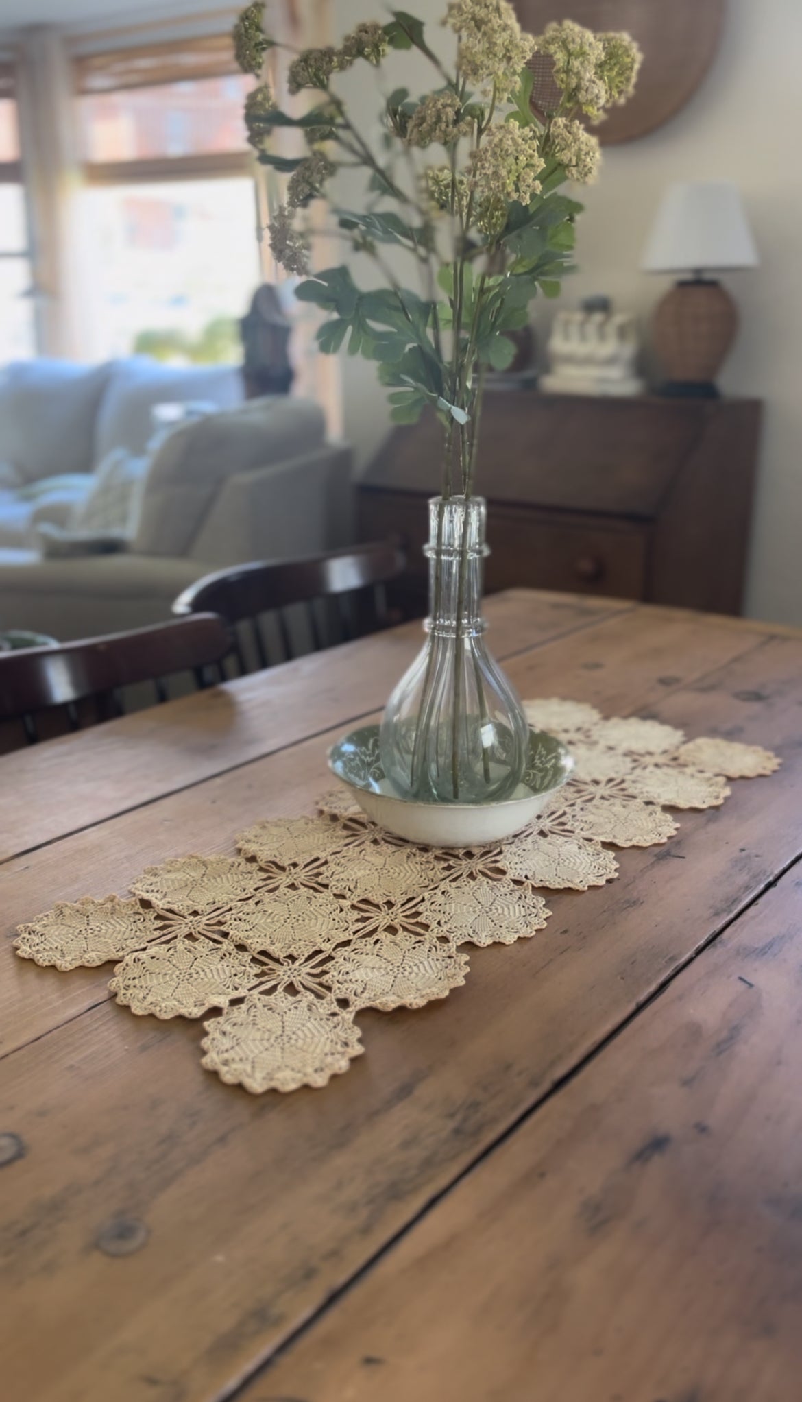 Add some charm to your dining room with our Crocheted Table Runners! These unique runners come in two sizes, small and large, and are hand-crocheted for a one-of-a-kind look. Elevate your tablescape and impress your guests with these stylish additions. In great vintage condition with minor staining due to age.