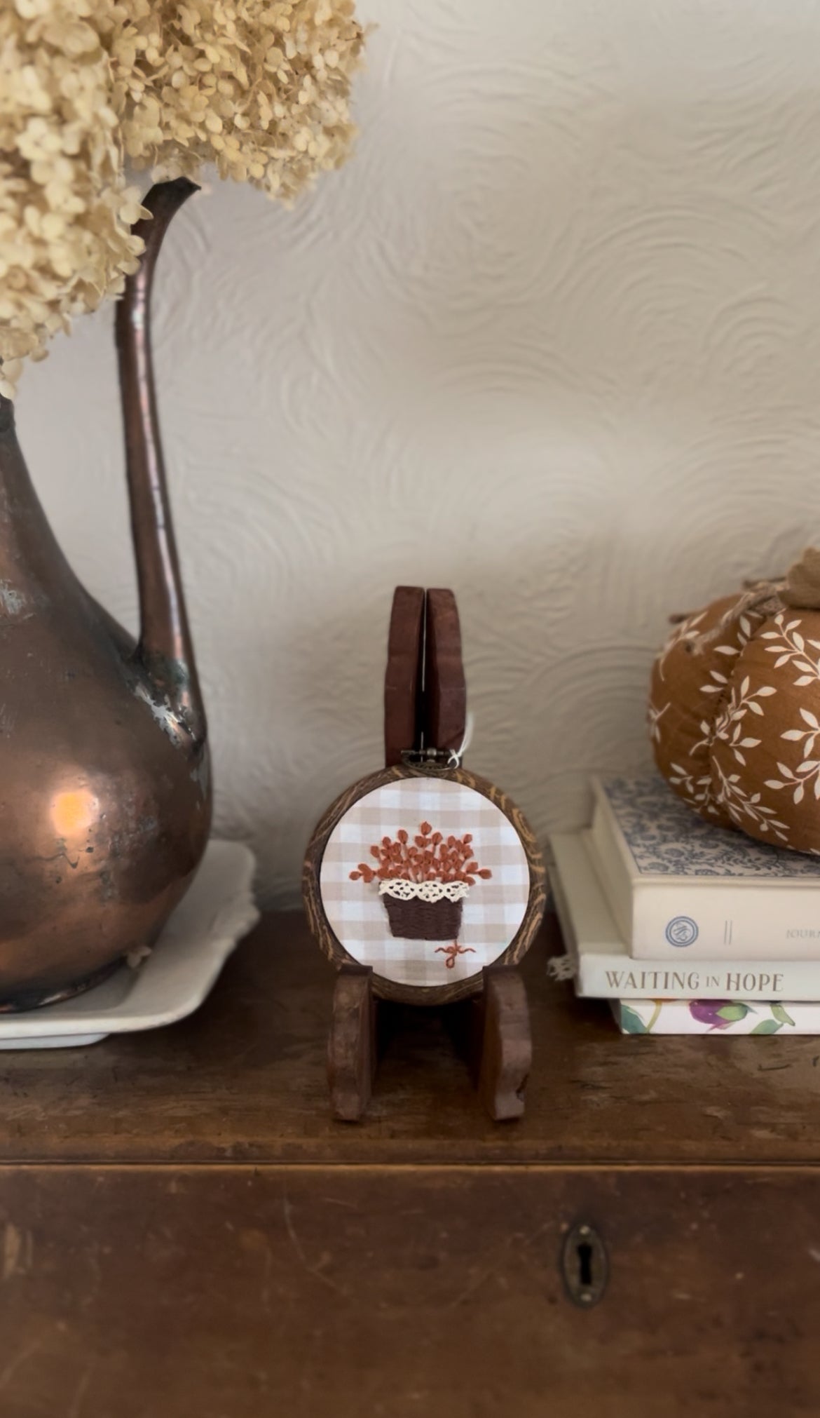 Hand-stitched and designed by Gabby, owner of Klapper Kottage. In a small 4" round embroidery hoop frame with magnets on the back for the option of being used as a fridge magnet.