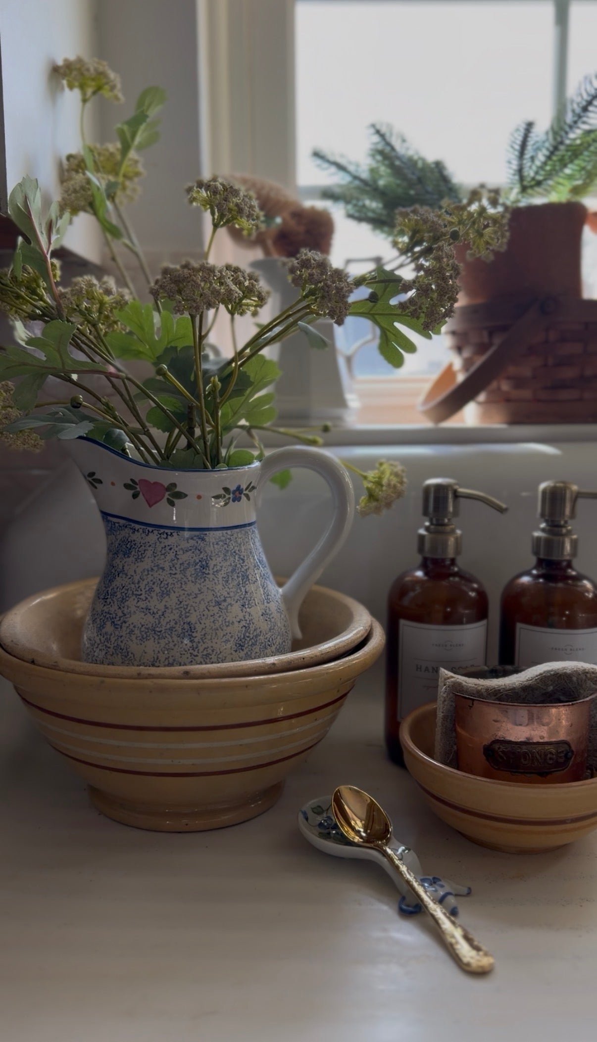 Fall head over heels for this whimsical vintage R.B. Bernarda Portuguese pottery pitcher, complete with a charming heart and floral pattern and beautiful blue sponged detailing that's absolutely swoon-worthy. This delightful piece is bursting with personality and Old World charm—display fresh-cut flowers or fill it with wooden spoons and cooking utensils for a kitchen that's both functional and fabulous. The handcrafted sponged finish gives it authentic character that mass-produced pieces simply can't match. Perfect for adding European flair to any room! In great vintage condition!