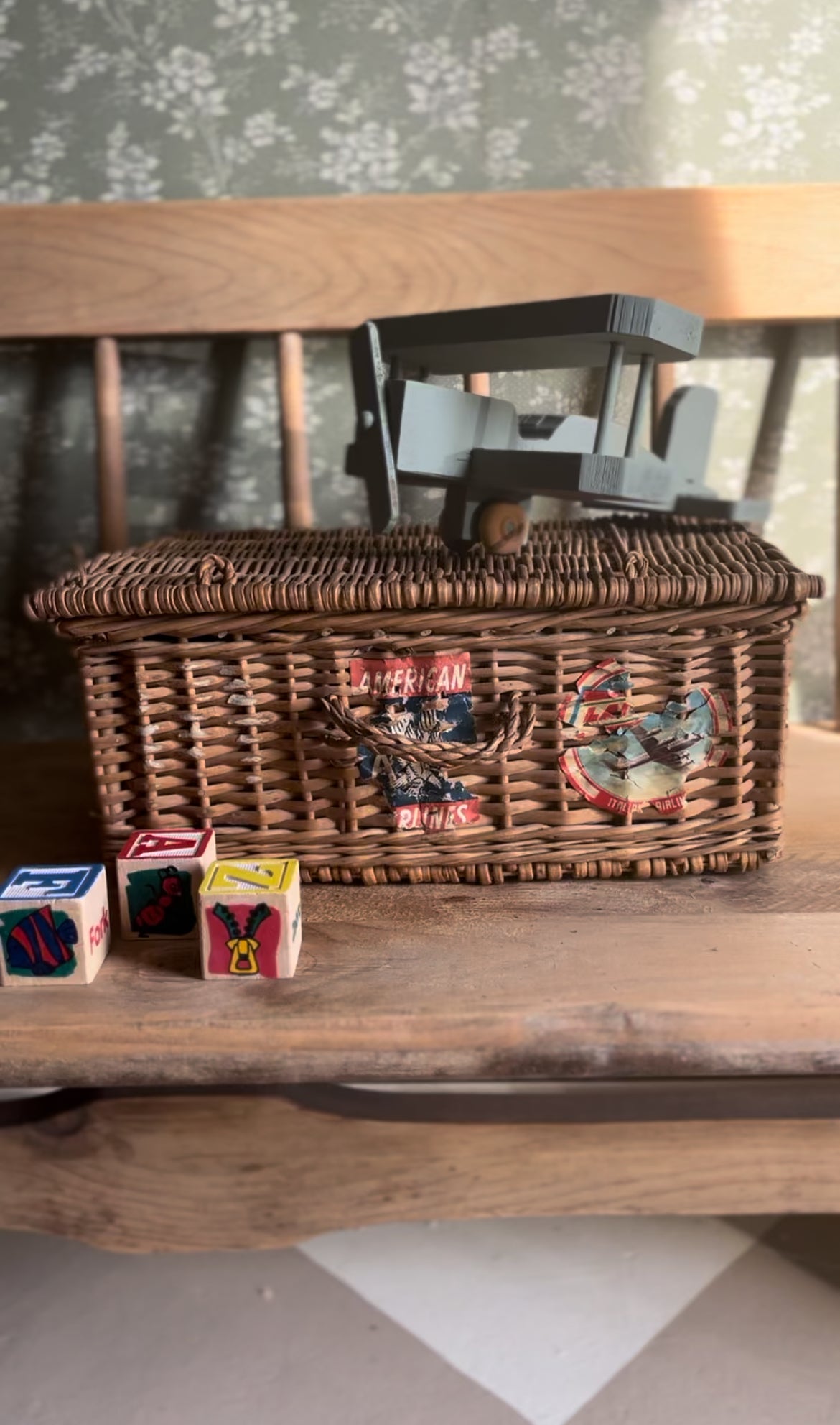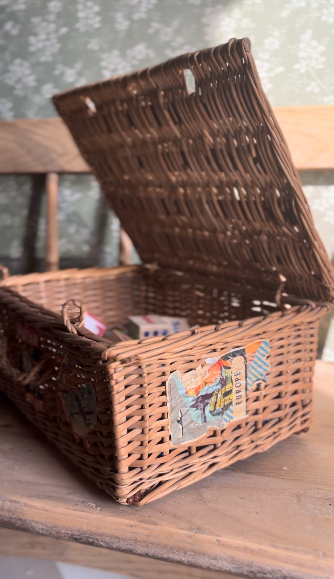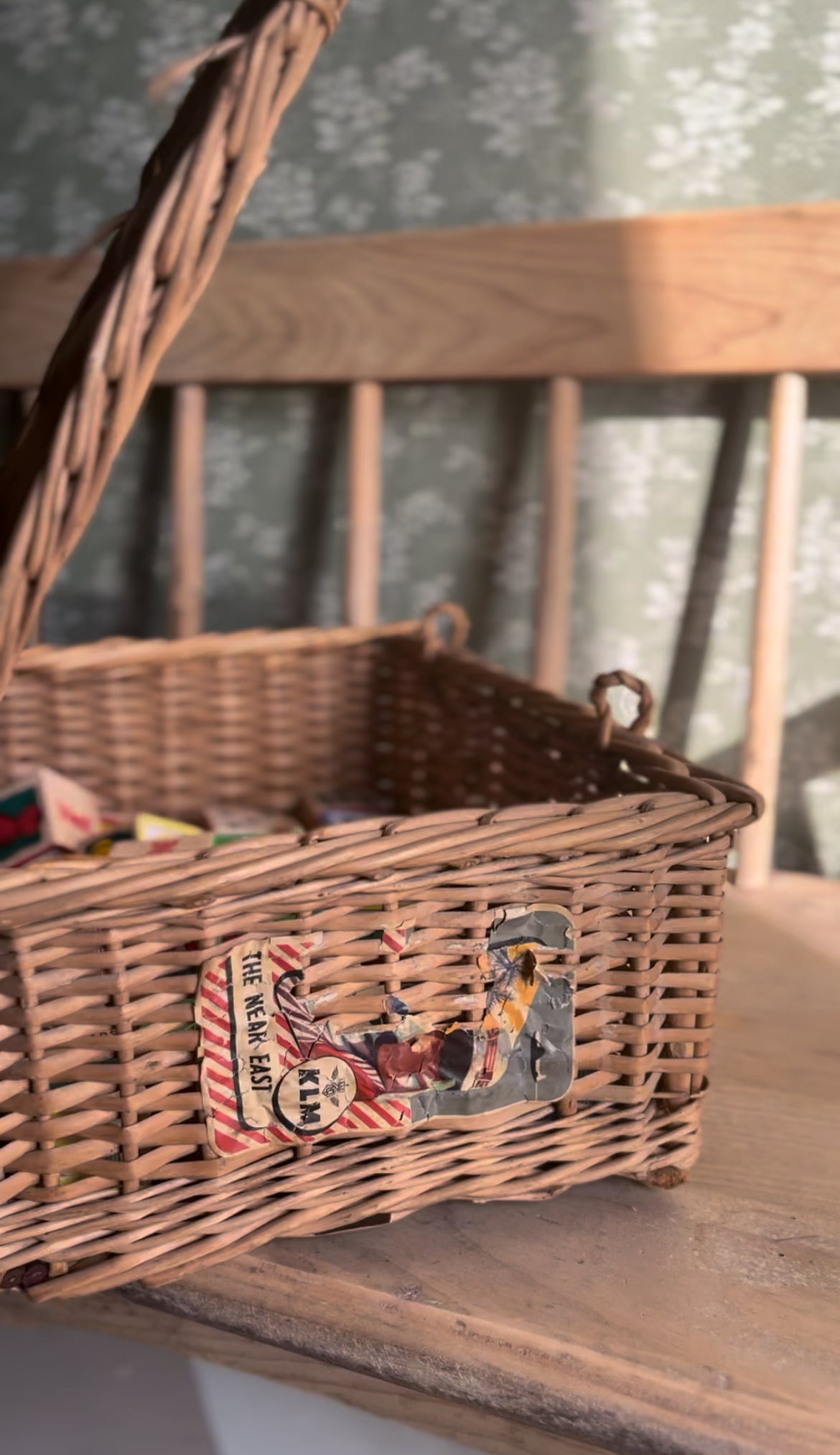 Add a touch of nostalgic charm to your child's room with our Vintage Wicker Basket with Lid, adorned with worn stickers. This delightful piece is perfect for storing toys, books, or blankets while bringing a vintage, whimsical feel to the space.