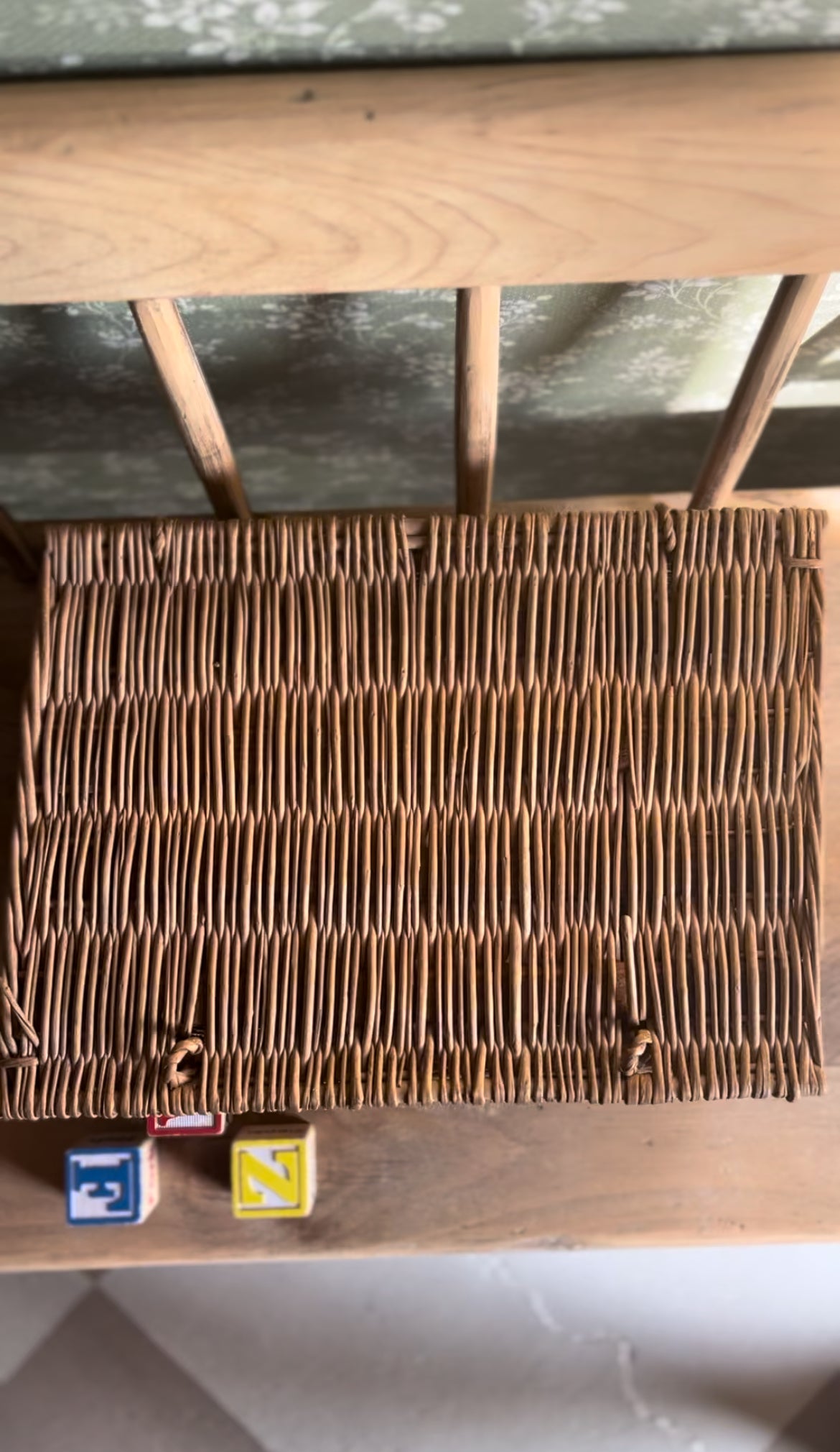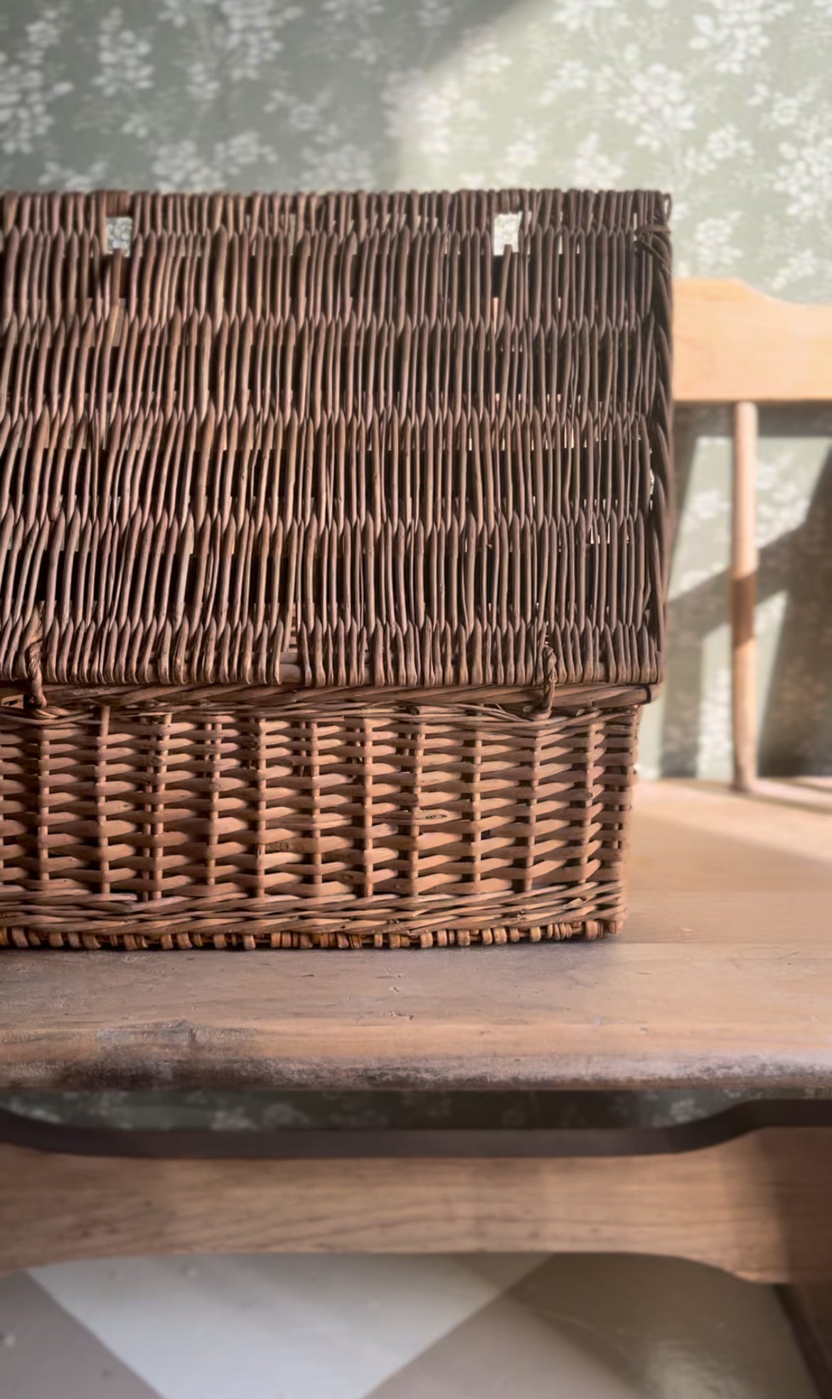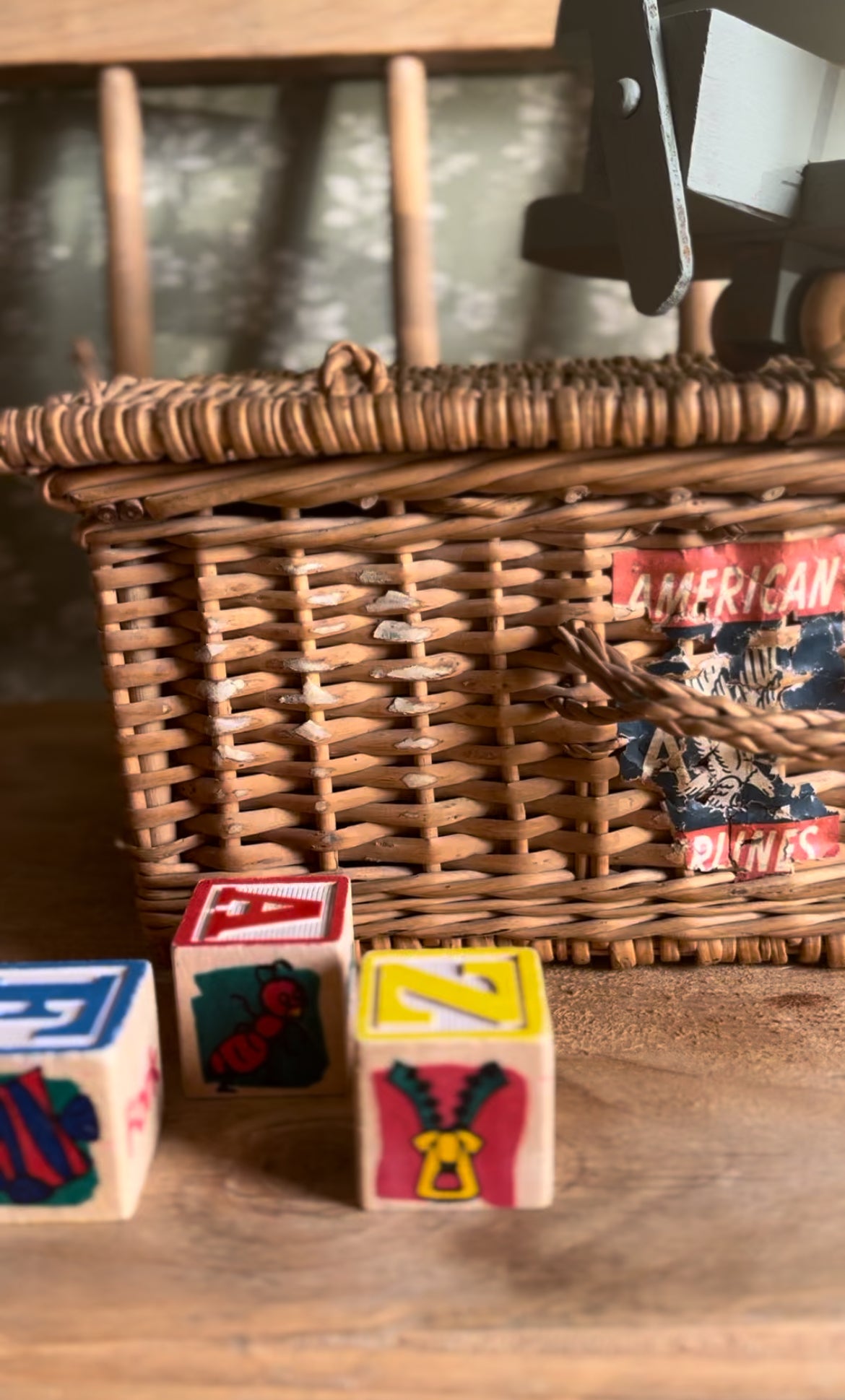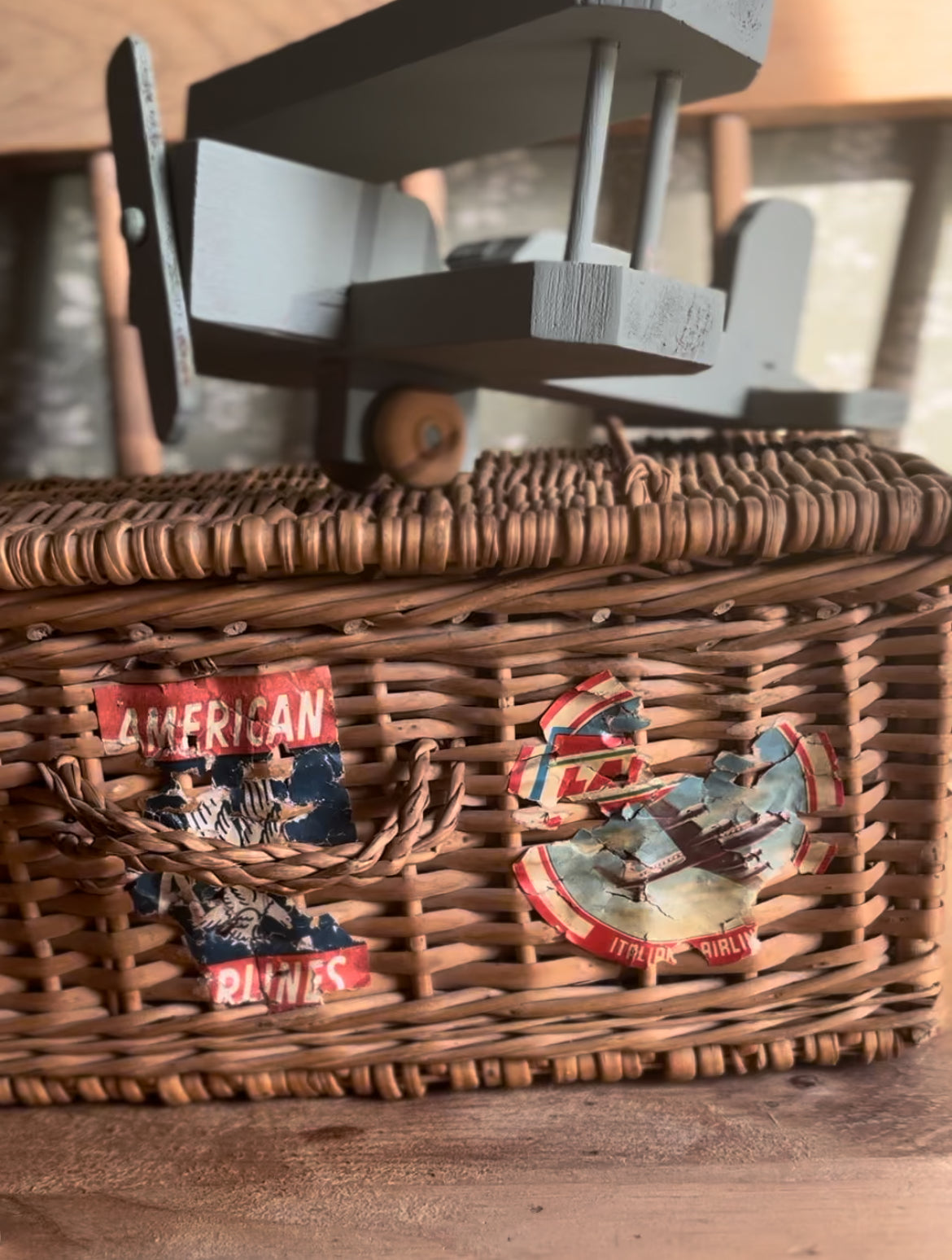 Add a touch of nostalgic charm to your child's room with our Vintage Wicker Basket with Lid, adorned with worn stickers. This delightful piece is perfect for storing toys, books, or blankets while bringing a vintage, whimsical feel to the space.
